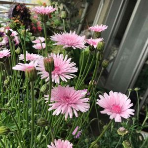 ◆桃色タンポポ アプローチに置いてある桃色タンポポ 庭に変化を付けるには充分な草丈!! その上この蕾の数ですから 本当に蕾の数だけ咲いたら 凄いことになる?!