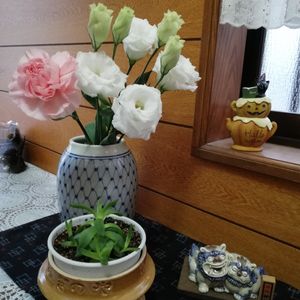 うちの今の中位の花瓶です💐 元々あった大手毬、アルストロメリアなどが、だんだん寂しくなってきたので、2本追加しました🌷 名前を控えそびえたのですが…白い方はドライにできそうかな⁉️