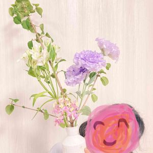 新しくお花を買ったので、元々あったお花を別の花瓶に活け直しました。娘がニッコリ持っている写真なんですけど、可愛く編集する技術がなく、心霊写真みたいで恐縮です😓笑笑