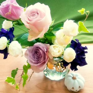 🎃大人のハロウィン🎃と言うフレーズが良いな~🤗と、切り花を簡単にアレンジしてみました☺️ バラ🌹の詳しい名前は分かりません😅