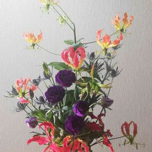 普段行かない所で好きな花を手にしたらこんな感じになりました😅 切り花はめったに買わないんだけど… グロリオサは珍しく2色 トルコキキョウは蕾に引かれました エリンジウムは知らなかったけど ルリ玉アザミに似てたから 我流なのでまとまりありません😁