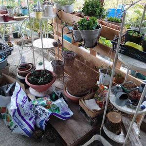 我が家の、植え替えとか寄植えとか、作業する場所です ゴタゴタしていて恥ずかしいですけどここにも木のパレットを立てています 上にはたくさん増やしたペチュニアを置いたり、吊るしたり! 多肉のめんどうなんかは左端のテーブルとイスで! 中央に見えてる柱にはノーゼンカズラを這わせていて、その左側はネットでこれから朝顔のカーテンにします ク〜ちゃんはどこでしょうではありませんがク〜ちゃんも写ってますよ