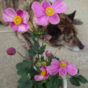 皆さんが可愛い秋明菊を投稿してらしたので、負けじと🤣 すご〜く小さかった秋明菊の鉢植えも今年はたくさん咲きました 🐶ク〜ちゃんにリボンみたいでしょ🤣