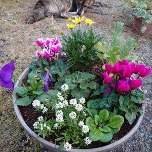 たくさん買ってきたガーデンシクラメンがポットのままでは可哀相なので仕事から帰って速効で寄植えしました ほとんどまだ咲いてないとか蕾の苗ですけど待ちきれずに投稿しました ガーデンシクラメン アリッサム プリムラマラコイデス プリムラジュリアン スプレーストック2色 ユリオプスデイジー パンジー