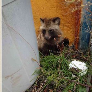 庭にとんだ訪問者が! 腐葉土のバケツの影にいるのは何でしょう? たぬき?
