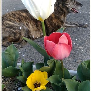 久しぶりの投稿です 今日のお花がチューリップということで去年出せなかったものです 🐶ク〜ちゃんの体の白いものは🌸桜吹雪です