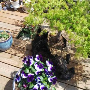 カエデがいい感じに日影となり愛犬くつろぎ中😊今日もお花とワンコに癒されました🍀