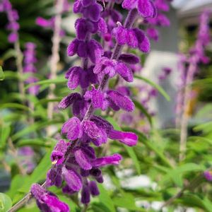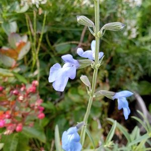 スカイブルー🩵の花が新鮮で綺麗です。サルビア アズレア タグには開花期は8月からになっていますが暑い間は咲かず、涼しくなってきたからの開花です。 めちゃくちゃ暴れて収拾不能なぐらいです😆麻紐で支柱に縛り付けて何とか自立しています❣️