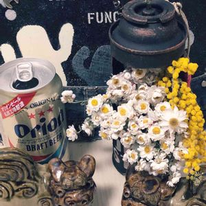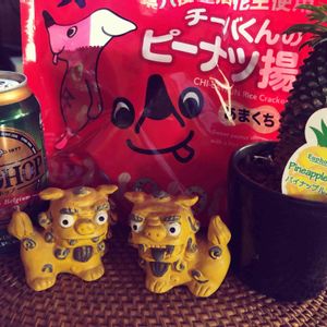連投Γ゜ 今日は4月3日、シーサーの日らしいので、狛犬?シーサー?よくわからないフィギュア😄行き着けの酒屋さんでオリオンビール、ある?と言ったらそんなの無いわ~💦シークァサーのハイボールで許して~🙀ハオちゃんは美穂錦の仔ちゃん😊