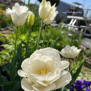 同じく〜白いチューリップ3種植え(^O^) 左に回り込んでみました🎵 手前のホワイトハートちゃん 薔薇のようなボリュームですね♡