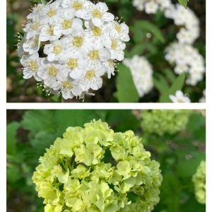 おはようございます☆〜(ゝ。∂) 丸っこい形が可愛い🥰 💠どちらも素敵に咲いています💠 小手毬は蕊がピンピンして 魅力的だし❣️ ビバーナムは緑色で お花のボールのよう^_^🎶💕