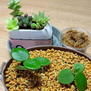 pic2枚目❣️ポチった ホヤのマチルダchanが大阪から到着しました〜😍 葉がまん丸でメチャ可愛ぃ〜😍 4枚目が到着したマチルダchanの根を包んでいた水苔を優しく取り省いて 根っこが沢山生えてくれていたので根を着けた茎を2本作り根腐れ防止剤を1番下に敷いたカップに水苔仕立てにして植えました💖 5枚目のタイトゴメchanはおまけで頂いちゃいました🥰 大好きなバス鉢にプラスしました🎶 これからの成長が楽しみです💖 すくすく育ってくれますように🌿🌿🌿🌿🌿