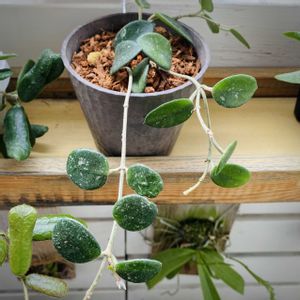 ホヤ・マチルダ 📝 育て始め2024年6月 育成期間1年4ヶ月 元気なくて、半分枯れてダメになったマチルダさん。 外に出しておいたら新芽が少し出てきました。 半分の大きさになったので、鉢下げして植え替えたら、案の定根っこが張っておらずすっぽり抜けた😳 うちで1番調子悪いホヤ…復活願う🙏