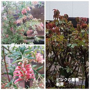 グレビレア 全体と一部をズームして撮りました。 ピンクの薔薇 消毒したいけど雨が降り出しました。新芽をすぐ虫から、やられるから😥