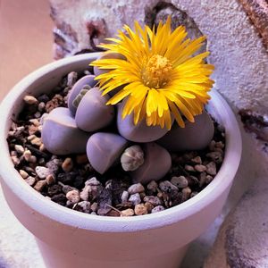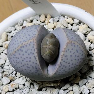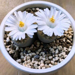 琥珀玉(Lithops karasmontana ssp bella cn17.8.6“SAKURA”) お迎えしてから約2年が経過したでしょうか、分頭して2つになり現在に至ります 花はまだかな〜?と思っていたところ、気が付いたら2つ仲良く白い花を咲かせていていました …か、可愛い…😍💕
