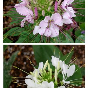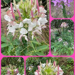 クレオメ セイヨウフウチョウソウ ピンクと奥の白いお花が色違いで咲いています☺️✨先週頃から少しずつ咲き進んでいます