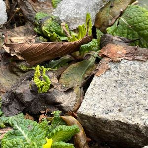 雪の下から咲きかけたプリムラポリアンサスが顔を出しました 雪の布団で冬を頑張ったのね