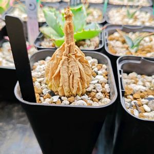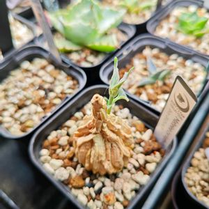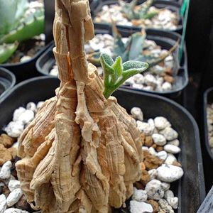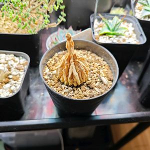 こちらのガガ様のお花は黒いお星様★★★ 花も蕾も葉に隠れちゃってます! 今年の花は5つかな。 葉がない時はコルクの棒にしか見えない面白いヤツです☝️😊 うちにやって来て約3年。 なかなか塊根が太りません😅