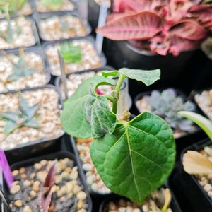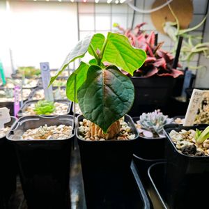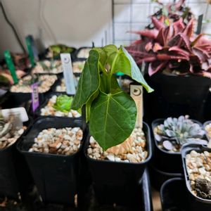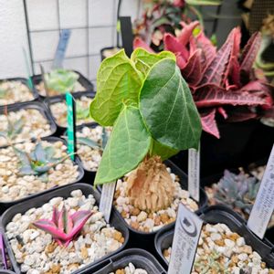 大雨なのに、通院。 本日のマテレア シクロフィラ。 こないだ投稿したちっさい新葉は、大中小ある 葉の「中」になります。 成長早いね〜。意外と茎が太い。