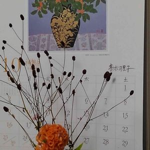 GS今日のお花 ワレモコウと 大好きな青木乃里子さんの 今月のカレンダーです。 版画絵です。