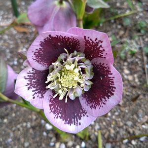クリスマスローズセミダブル 中庭で俯いて咲いてます 清楚な色🤍💚 息子一家はUSJに遊びに行きました 夕食は2人なので外食、大好きな焼肉食べに予約してます 暖かいから今日は頑張って植え替えします