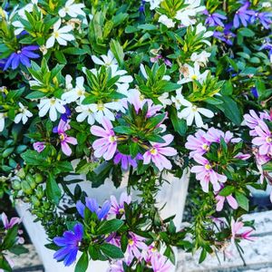 草花の寄せ植えですが、全部のお花が綺麗に咲き揃うのは難しい😓 今は、ブルーファンフラワー、スカエボラが良き💙 イソトマは切り戻してやっとポツポツ カリブラコアは真ん中が空洞💦 寄せ植えは難しい🤔