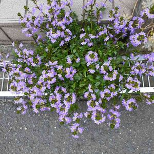 スカエボラ(ブルーファンフラワー) 扇形の濃い紫寄りの青色のお花です。 この夏限りと思ってベコニアの隣に植えたのですが多年草と知り😵慌ててベコニア抜き、このお花さんだけにしました。土もプランターも古いので大丈夫かなと思ったんですが、今のところ元気😅とりあえず肥料あげましたよ(←初心者)😊