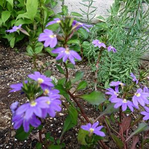 スカエボラやニオイバンマツリ、桔梗、ブルーサルビア、アメリカンブルー、アンゲロニアの去年の寄せ植え。宿根して花が咲き始めました♡