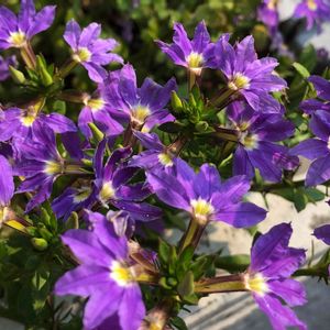 スカエボラの青・紫・白の3色が揃いました。 扇状に5枚の花びらを広げたようなこの花は、別名ブルーファンフラワーとも言います。 葉っぱは綺麗な緑色で光沢があり、茎を横に伸ばして這うように広がります。 オーストラリア南東部原産。 クサトベラ科の常緑多年草。