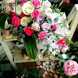芍薬とピンクのバラ 朝、お庭で摘んだので とてもいい香り❁*. エントランスの ダストパンに飾って 今日もお仕事行ってきます♡ (*˘︶˘*).。.:*♡