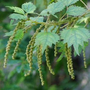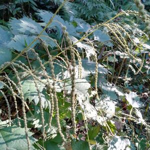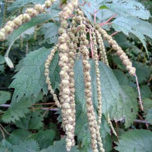 前にもあげたんですが、あまり成長してなかったので、アカソなどとの違いがハッキリしませんでしたが、これは大きく育ったイラクサ科カラムシ属の「メヤブマオ」です😊 アカソとヤブマオの交雑種起源と推定されていて、葉はどちらかというとアカソ寄りで先端が大きく3裂、時にアカソみたいな亀葉状になることもあります。 でも、とにかく株がデカい❗️ 下の葉などは掌なみの大きさがあり、先端の雌花花序は、少し間隔を空けた数珠状の白い姿になります。 葉が、大きな欠刻状というより揃った感じの鋸歯葉で、雌花花序が太くて隙間がメヤブマオより狭いと、ヤブマオです🧐