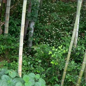 おはようございます😃 散歩途中にある竹藪です。 竹藪は少なくなりました。 今年、家から一番近い竹藪が消えました。 住宅地に変わりました。😂 竹藪の中、一面に白い花が咲いています。 トキワツユクサの群落です。 この草は竹藪でよく見かけます。 こんな日陰が合っているのでしょう。😊 手前の丸い柔らかそうな葉っぱは葉先の様子から、 メヤブマオだと思います。 私は、ヤブマオやカラムシの葉っぱがなんとなく好きです😊