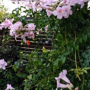 ノウゼンカズラ まだまだ残暑厳しい日。 ぶらり〜とぶら下がった ノウゼンカズラが元気よく とてもかわいかった 𖤣𖥧𖥣。𖤣𖥧𖥣。♥️