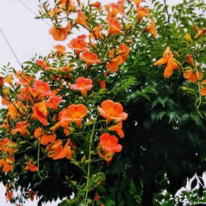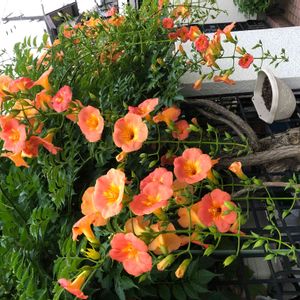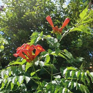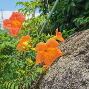 ご近所の病院の駐車場に咲いているノウゼンカヅラ、オレンジ色で美しく咲いていました😍🌿