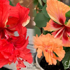 今日のお花 左上から時計回りで 斑入りハイビスカス スノーフレーク ハイビスカス ロングライフ ケイト ハイビスカス フラミンゴ ハイビスカス オレンジフラミンゴ みんな可愛いー(*´艸`)❤︎"︎