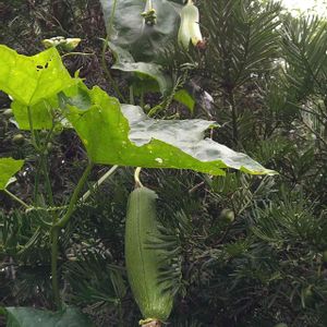 木にツルが伸びて ヘチマが太くなって来ました メタボまで 2cmあるわと 食べる妻 妻も成長、太くなってます😅