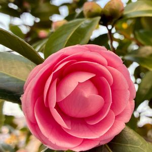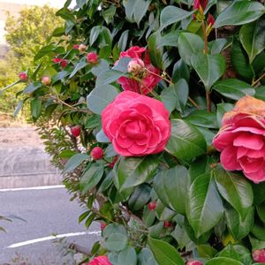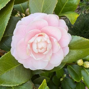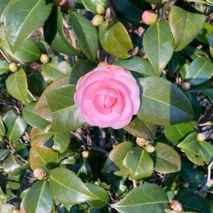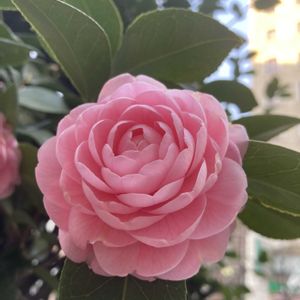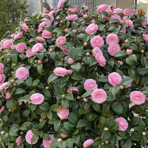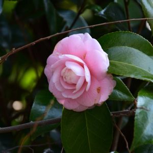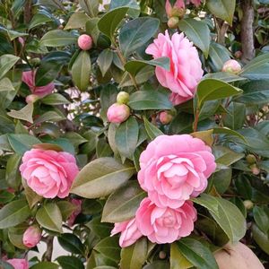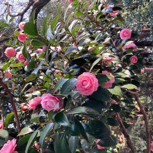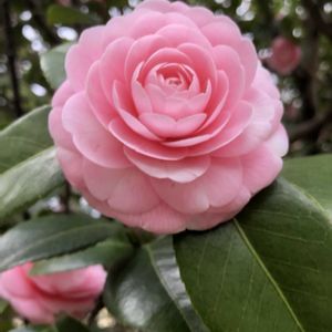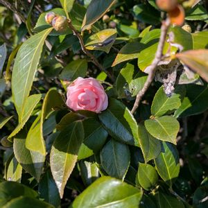 家近くの⛩️神社のオトメツバキ(乙女椿)の花が満開です♪ 樹齢何年でしょうか。見上げる高さ5m以上に成長した3本の花木です♪ 花は淡い桃色の千重咲きで、中輪、花弁がまるいです。 花ごと落花します。 🏷️月曜日はピンクの花を