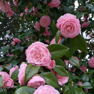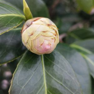 乙女椿(オトメツバキ) ツバキ科ツバキ属の常緑低木。江戸時代からの品種で広く植えられている。日本のツバキにはヤブツバキ系、ユキツバキ系、その交雑のユキバタツバキがある。本種はユキツバキ系の園芸品種で、ユキツバキの特徴である木は横張り。葉柄は短く短毛があり、葉脈は網目状に浮き出る、縁の鋸歯が鋭いなどの特徴を示す。花期は3~4月だが12月にも咲く。花は淡いピンクの千重咲きで花径は40〜60㎜。果実はつかない。 名前の由来は、江戸時代に乙女椿が栽培されている加賀藩から他藩へ門外不出となった『御留め令』が出たことから『御留椿』になり『乙女椿』に変わった。1829年(文政12)の『本草図鑑』に記載がある。ピンクの千重咲きで、当時のツバキのイメージを一新した。その他の由来として、実を結ばないことが結婚前の乙女を思わせるという説、可愛い花姿が乙女を連想させるからという説などがある。 出典『花木・庭木』『日本の樹木』『鑑定図鑑 日本の樹木』『愛・地球博記念公園HP』