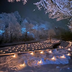 湯西川温泉にある平家の里。 茅葺屋根の家と木々のライトアップ。 タイムスリップした感じ。 ヒンヤリゆったり散策癒されます。