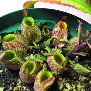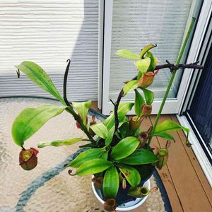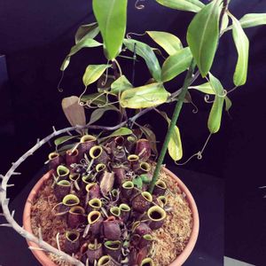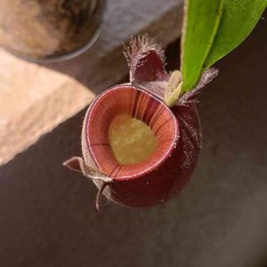 アンプラリアレッド×ブラック 昨年末の12月、挿し木に初チャレンジして4分割しました。なんとか上手くいったようで発根を確認‼️ かなりの時間を要しましたが、頂部の挿し木はピッチャーが付きました。😃✌️