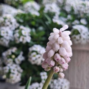 ムスカリ💗ピンクサンライズ 桃花🍑の可愛らしいムスカリ💗 開花期は3月~4月 細葉のスマートな草姿で、 鉢栽培向き。 休眠期(高温期)の多湿は❎ 涼しい時期に良く育つので、3月中旬迄は適時追肥、花柄摘み。