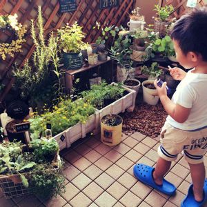 お水やりが大好きな、我が家のちびっ子ガーデナー🤗 ラムズイヤーの触り心地を確かめてます🐑💦