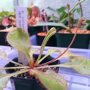 (私も)頑張れシリーズ第三弾 ドロセラ アンドロメダさんですʕ•ᴥ•ʔ ドロセラ プロリフェラとドロセラ シザンドラの交配種となります。 なんか色々タイプ違いがあるみたいですが、この子は(本来)赤くなるタイプみたいです🐾 ウチに来たときは元気な大小四株があったのですが、植え替えて間もなく、全ての葉が溶けました😥 ただでさえドロセラの植え替えは気難しいのに、猛暑の7月にしてました。 今思うと恐ろしいことしてますね😒 しかし、二株だけ芯は残ってくれてたようで、ここまで復活してくれました、ありがとう✨ ベゴニアみたいにケースに入れてないので湿度が足りないのか、粘液は今一ですがこのまま育って欲しいです。 頑張れ~ʕ•ᴥ•ʔ