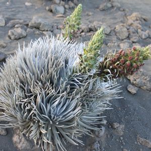 世界の植物フォトコンテスト。投稿② ハワイ諸島の限られた山上でのみ見られる花、ギンケンソウ❗️ マウナケア山頂⛰サンセット&星空☆観測ツアーに参加。 標高4205mでの最高のサンセットを見に❗️ 途中標高約2800mのオニズカ・ビジターセンターで、体を標高に慣らすための休憩と夕食をとる。ここでギンケンソウとの出会い♫ 3本の花軸。1本には花が。 人が触ると枯れてしまうとの注意の為、そっと近くで観察。 (手を触れると法律で罰せられるとの記載の資料あり) ギンケンソウ(銀剣草) キク科 Wikipediaに一度咲くと枯れると書いてある。 ハワイ諸島の固有属で全部で5種知られたが、1種は1945年以前に絶滅。 2011/7 マウナケアにて撮影