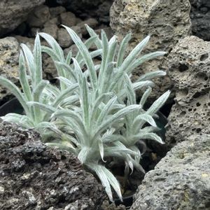 「ギンケンソウ」 銀剣草 珍しい植物です 3株展示 組織培養(クローン)でよみがえった ハワイマウイ島固有種 絶滅危惧種 まだ小さいです。特別室でガラス越しですが今月から展示です♪ 大きく無事成長を🙏
