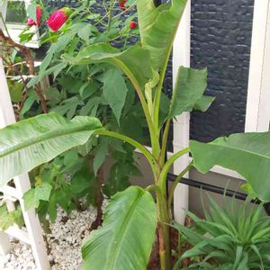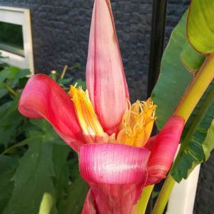 今朝のピンク🍌。 台風にも負けず、葉っぱの痛みは多少あるけど、大型サイクロンの襲来するインドの植物ならではか。一時的に浸水したとしても根っこが生きてればなんとかなる、はず。