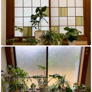 上がbefore 下がafter 非常に日当たりが悪い家の、数少ない東側の窓で午前中日光が入るところです。 障子を外して、窓に防犯と直射日光を避ける為に、シートを貼りました😊 部屋の中も明るくなりました✨ エアコンの下の窓辺にいる植物達をこちらに移動😃 これでエアコンも使えるし、植物達も朝日を浴びれるはず!!✌️