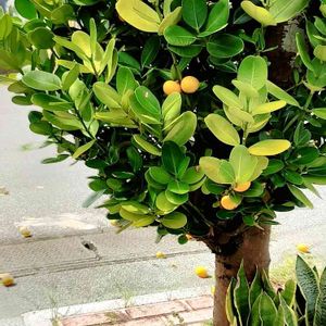 みかんでも柿でもありません。 フクギの実です。沖縄に住みはじめた頃、友達に聞いたらこれは食べられんよ、これを食べるのはオオコウモリだけよーと言われました。