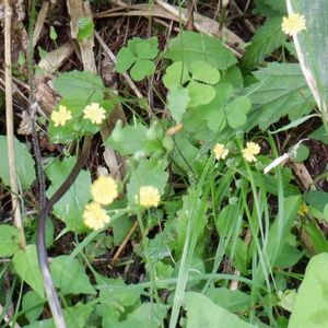 里山散歩 三毳山 4/12 大はしゃぎで群生する山野草たち その3 ちょっと緑がかぶって見にくいですけど、これまた斜面一面に大群生してる「オニタビラコ」です🌱💚 型としては、茎が緑で何本かが立ち上がって、茎葉があまり見えないから「アオオニタビラコ」ですね😊