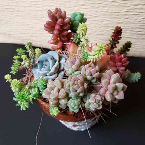 そして初チマ寄せの結果ですʕ•ᴥ•ʔ✨ 個人的には初めてにしてはできた方だと思うのですが如何でしょうか(´д`) あちこち方向が定まってないのは御容赦下さい( ´艸`) チマ寄せ、思った以上に大変ですね(´д`) 途中心が折れそうになりました😂 ほとんどのセダムは元々他の鉢にあったものや前の寄せ植えの子たちですが、真ん中の二種類は新顔です。 チマ寄せの為に狩ったジョイスドロップ錦さんとミニベル錦シルバーさんになります🙌 とりあえず全部根無しなのでまずは発根してくれることを祈りますʕ•ᴥ•ʔ